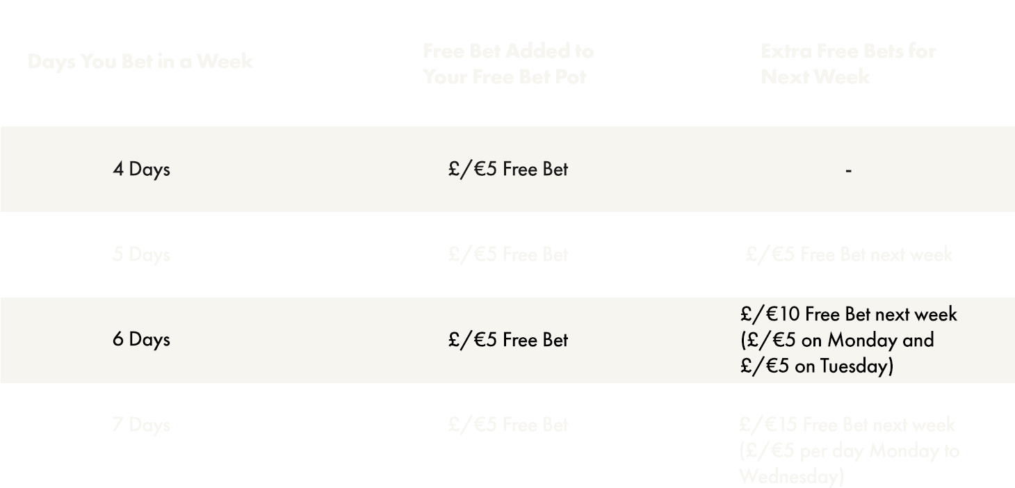 Bet on more than 4 days in a week to increase the Free Bets you’ll receive the following week.