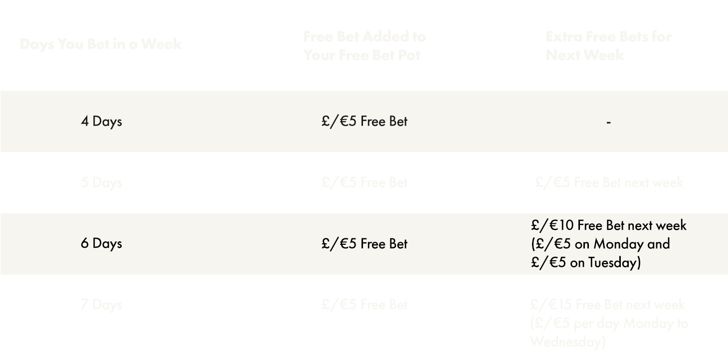Bet on more than 4 days in a week to increase the Free Bets you’ll receive the following week.